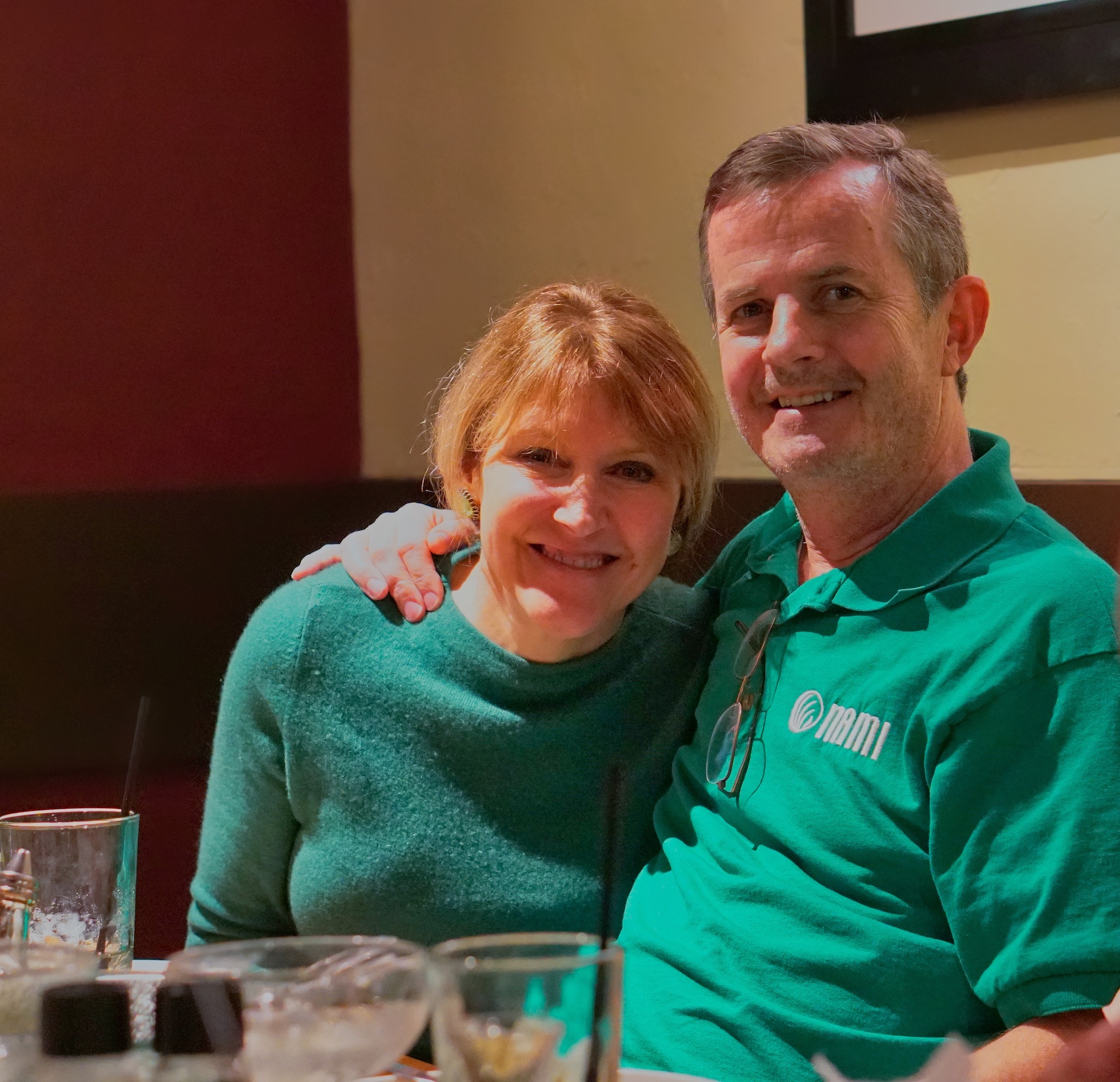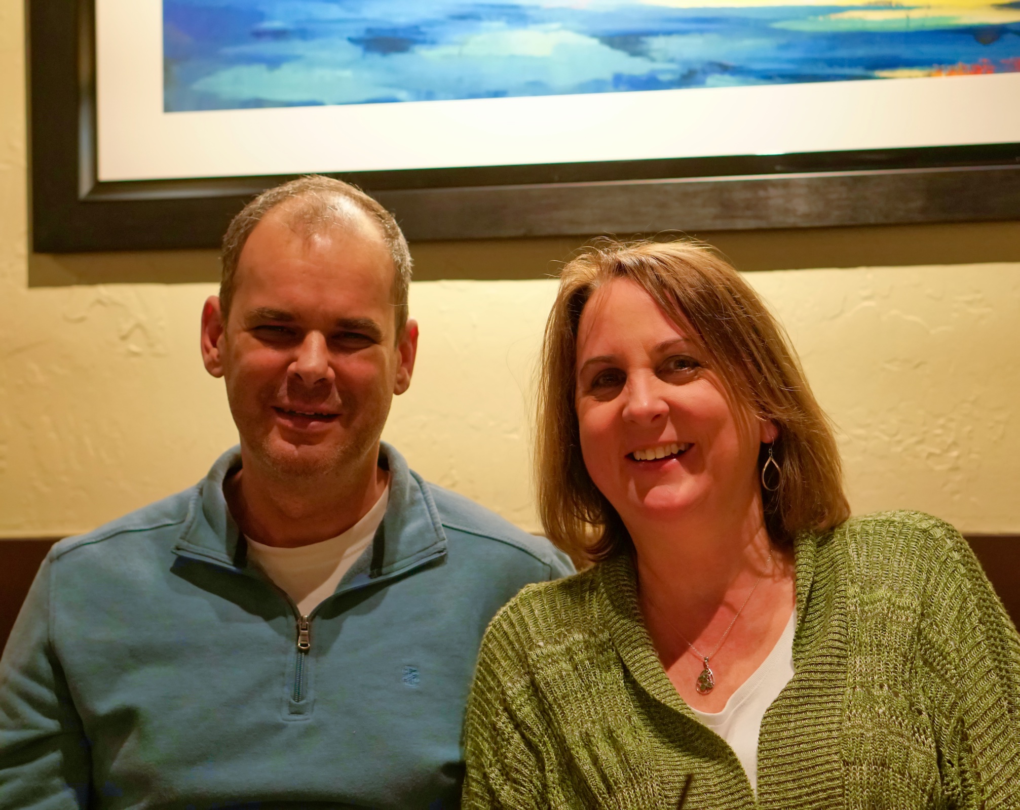 CJ in a green and blue plaid shirt, holding up his birthday cheesecake. Next to him is his wife Melissa who has awesomely colored dark auburn/purpleish hair and earrings that are like cut out leaves.